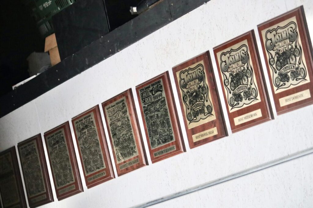 そのうえには、YOKOHAMA HOTROD CUSTOM SHOW や JOINTS、NEW ORDER CHOPPER SHOW、COOL BREAKER といった名だたるカスタムショーで受賞してきたプレートの数々が展示されています。『車坂下モトサイクル』の歴史が垣間見えるコーナーでもあります。