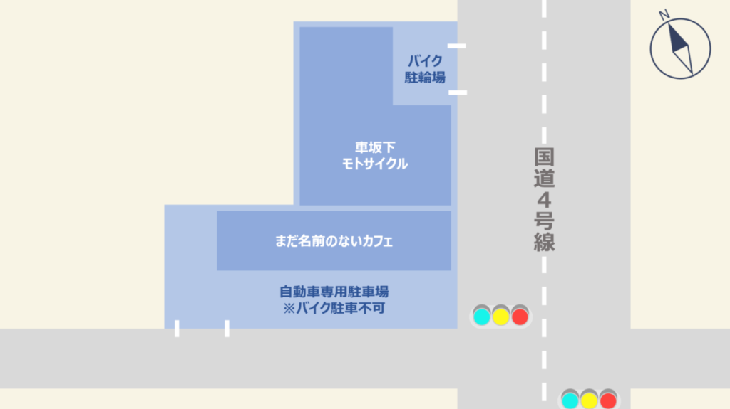 カフェの前には広大な駐車スペースが。ただし、こちらは自動車専用駐車場で、バイク駐輪場はカフェ2階部分のバイクショップ前(国道4号線沿い)になります。カフェの2階部分で、国道4号線沿いにある『車坂下モトサイクル』前にバイク駐輪スペースが設けられているので、そちらに停めてください。
