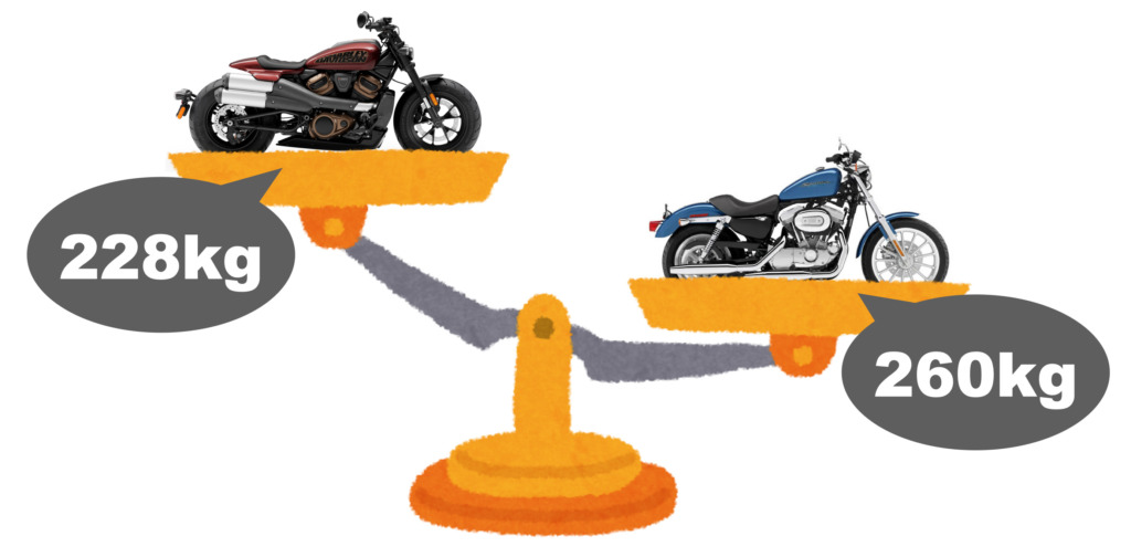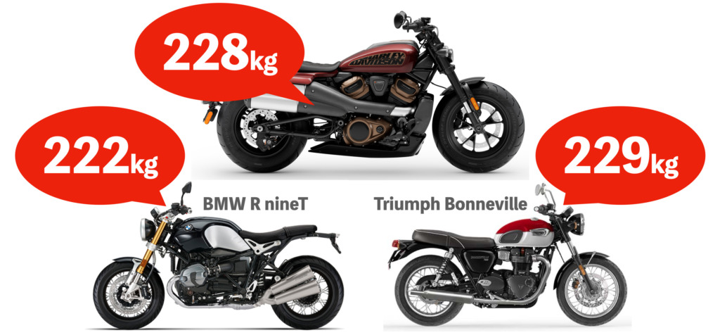 気になる重量はというと、228kg。フォーティーエイトなどに代表される前任のラバーマウントスポーツの重量が平均260kgだったことを考えると、水冷エンジン + モノショックフレームという見かけだけじゃないキャラクターの変貌ぶりが窺えるかと思います。インディアン FTRが218kg、BMW R nineTが222kg、トライアンフ ボンネビルが229kgと、ライバルとなるモデルと互角の軽さ。スポーツバイクとしての進化を遂げつつ、ライバルに肉薄する仕上がりになっていますね。