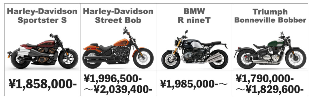 1,858,000円という金額がどのような価格帯か、近しい販売価格のモデルと比較してみました。同じハーレーダビッドソンのなかで見ると、ストリートボブが1,996,500円〜2,039,400円。競合モデルとなるBMW R nineTが1,985,000円から。スポーツスターSと同じボバースタイルで、排気量1,200ccのトライアンフ ボンネビルボバーが1,790,000円〜1,829,600円。