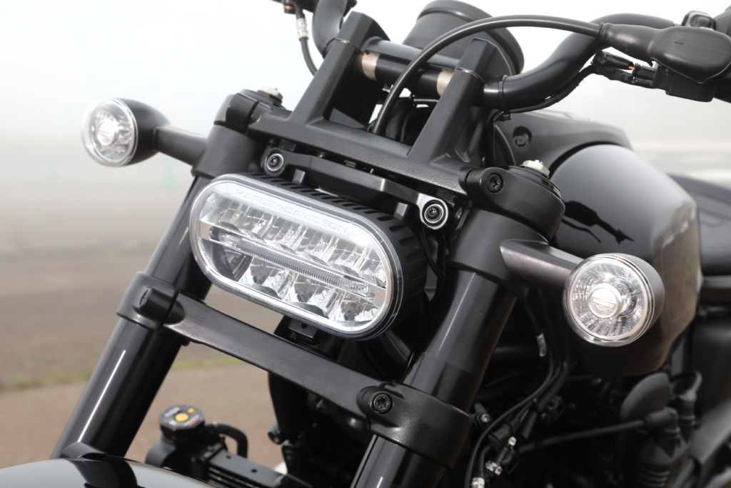 ヘッドライトは当然ながらLED。デザインはハーレーダビッドソン・ファットボブと同じ横長楕円形です。太いタイヤを履かせるとフロントフォーク間の幅が広がり、まん丸いラウンド型ヘッドライトだと間延びしてしまうのでデザイン性と合わせての設計と思われます。