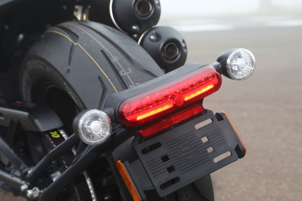 車体左側スイングアームから伸びるステーに、ナンバープレートとセットでテールランプとウインカーがマウントされています。180mmという極太リアタイヤとの組み合わせもあって、ドゥカティ・ディアベルに似たディテールですね。
