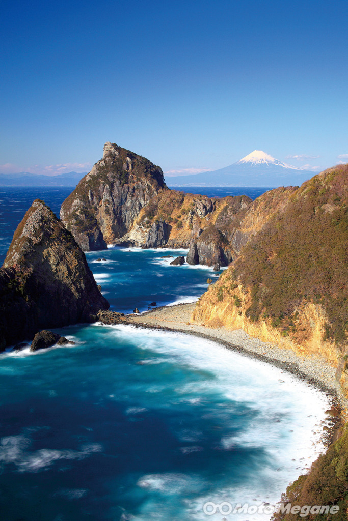 烏帽子山は、標高160メートルを越える高さにそびえる火山の根。海から急傾斜で立ち上がる烏帽子山の姿は大迫力だ。山頂の雲見浅間神社へ続く歩道もあり、山頂からは伊豆西南海岸や富士山、駿河湾の絶景を楽しめる。この位置からは手前に千貫門が見える。静岡県賀茂郡松崎町