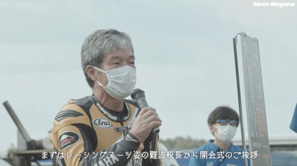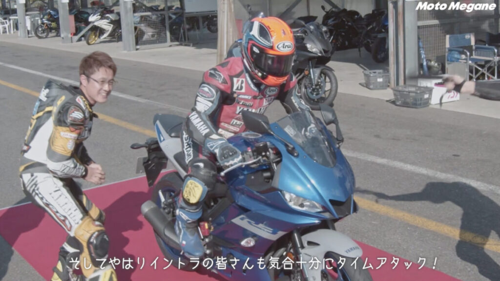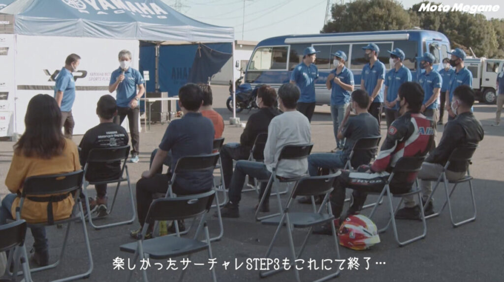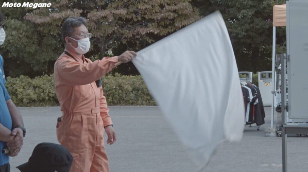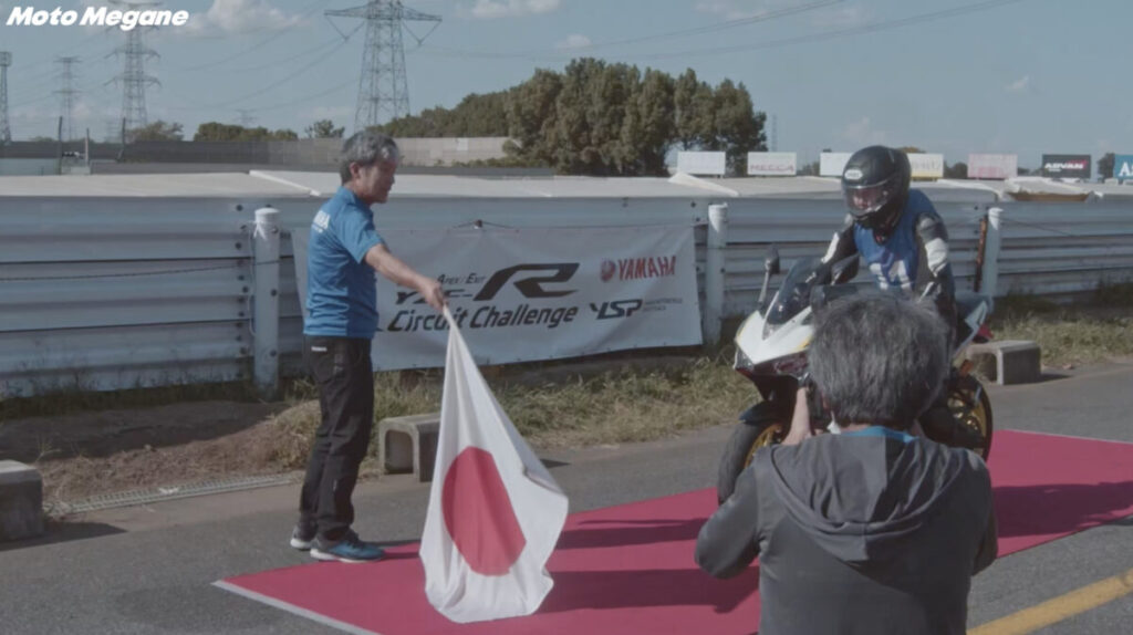 YZF-Rサーキットチャレンジ最後の総仕上げとして行うのが、コースを単独走してラップタイムを計測するタイムアタック。難波校長直々にスタートフラッグを振り下ろしてくれたり、全日本ライダーがパラソルを持ってくれたりとイレギュラーすぎる空間ではあったものの、皆がぞれぞれステップ1からの練習の成果を全て出し切って走る姿は自身にあふれていた。