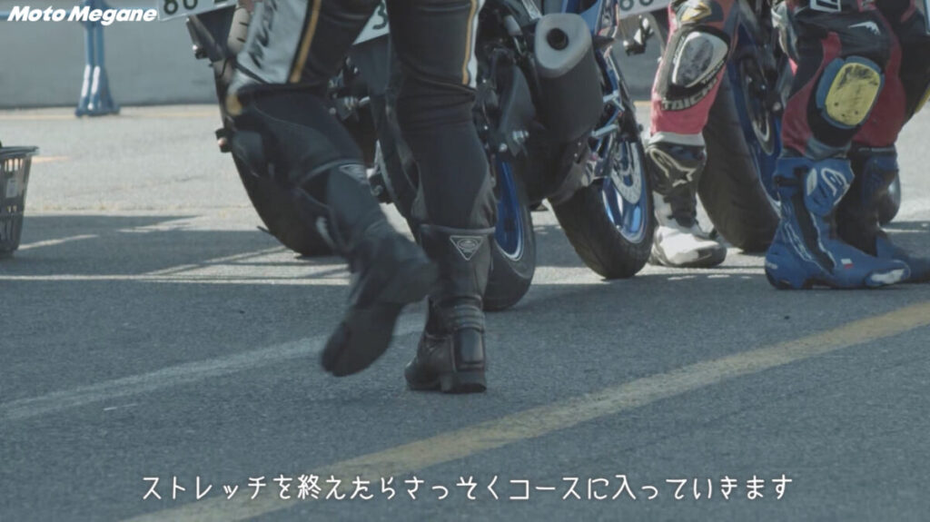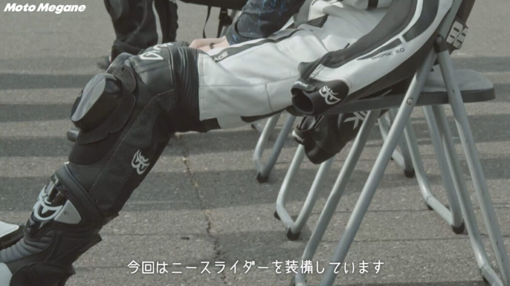 また、ステップ2と変わった事といえば、今回は新たに参加者全員がニースライダーを装着しているというところ。これまでのレッスンの集大成となるステップ3では、積極的に膝を擦ろうという練習があるわけではないのだが、本気度の高い走行に近づくにつれて膝でバンク角を確かめながら走行するライダーも多くみられた。