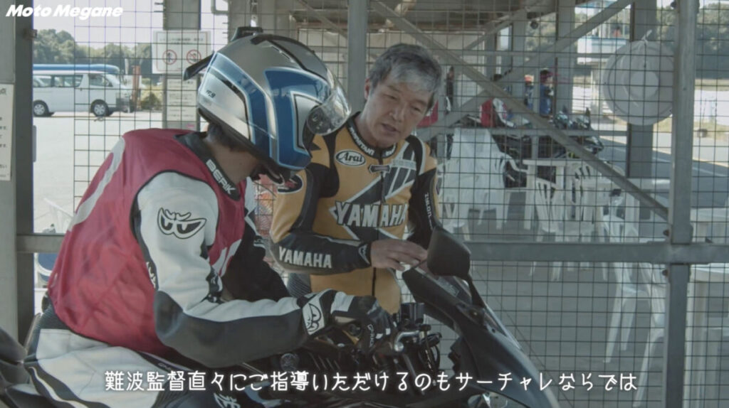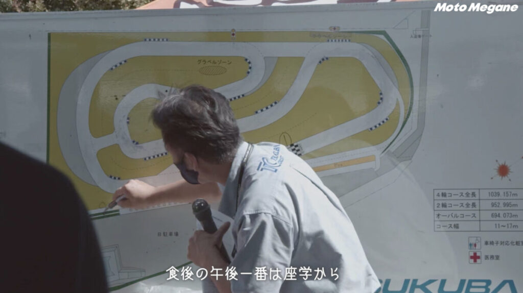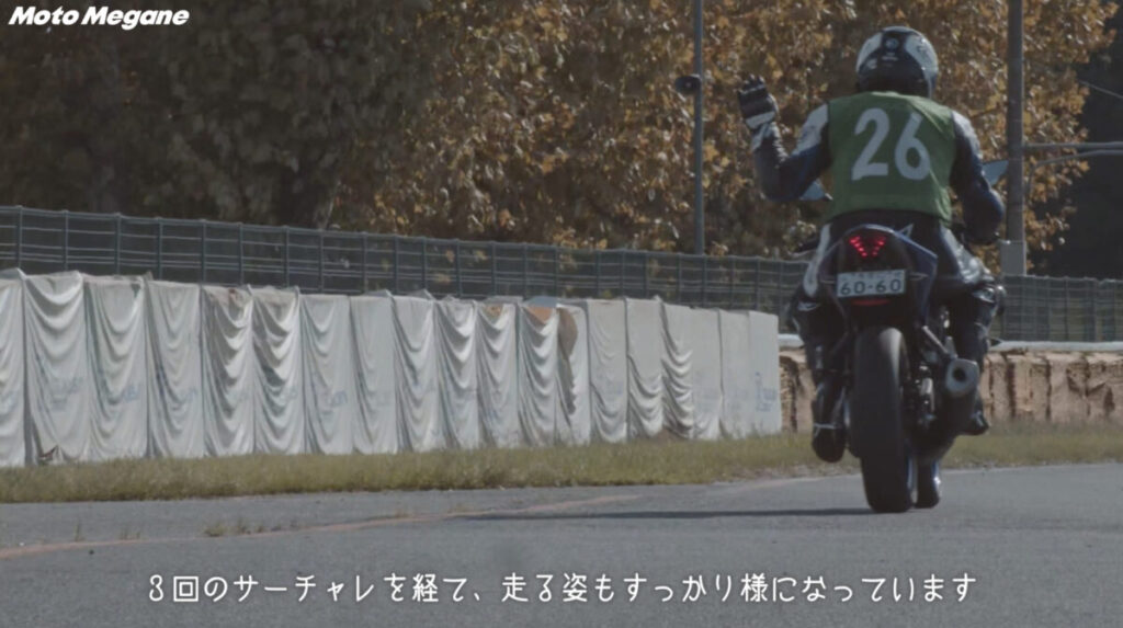 座学の後は午前の走行からそれぞれの速度域に合わせたいくつかのグループに分かれて、コースに入っていく。参加者の走行を見る為に講師陣も混ざって走行するのだが、講師陣がとにかく速い。特に難波校長の走りを身近で見ることもできたのだが、さすがは校長。コーナー進入時のブレーキングや複合コーナーの旋回速度は本当に同じバイクなのかと疑ってしまうほどだ。