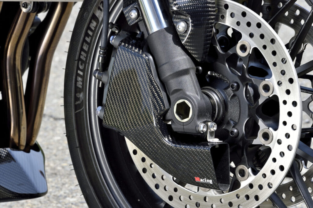 フォークガードを一体形状にすることにより、飛び石などからフロントフォークのインナーチューブを守る。