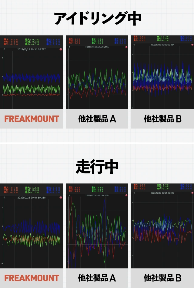 (※以下画像はFREAKMOUNTと他社製品A(一般的なスマホホルダー)、他社製品B(振動吸収ダンパー付きスマホケース一体型のスマホホルダー)との振動比較テスト結果です。)
