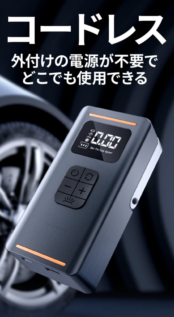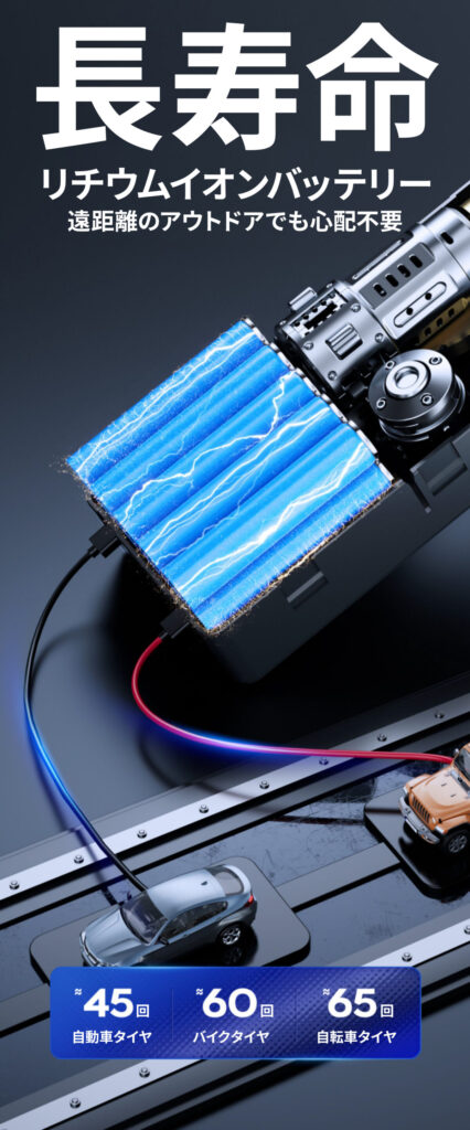 Gamp-Jetはリチウムイオンバッテリーを使用しており、電源の持続時間が長いです。6000mAhの大容量バッテリーなので、満タンに充電した後であれば、最大4台の車のタイヤに空気を入れることができます。