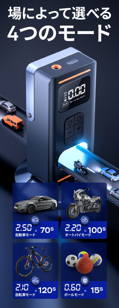 選べる4つのモードで簡単に空気注入が可能!6000mAh大容量バッテリー搭載の電動空気入れ