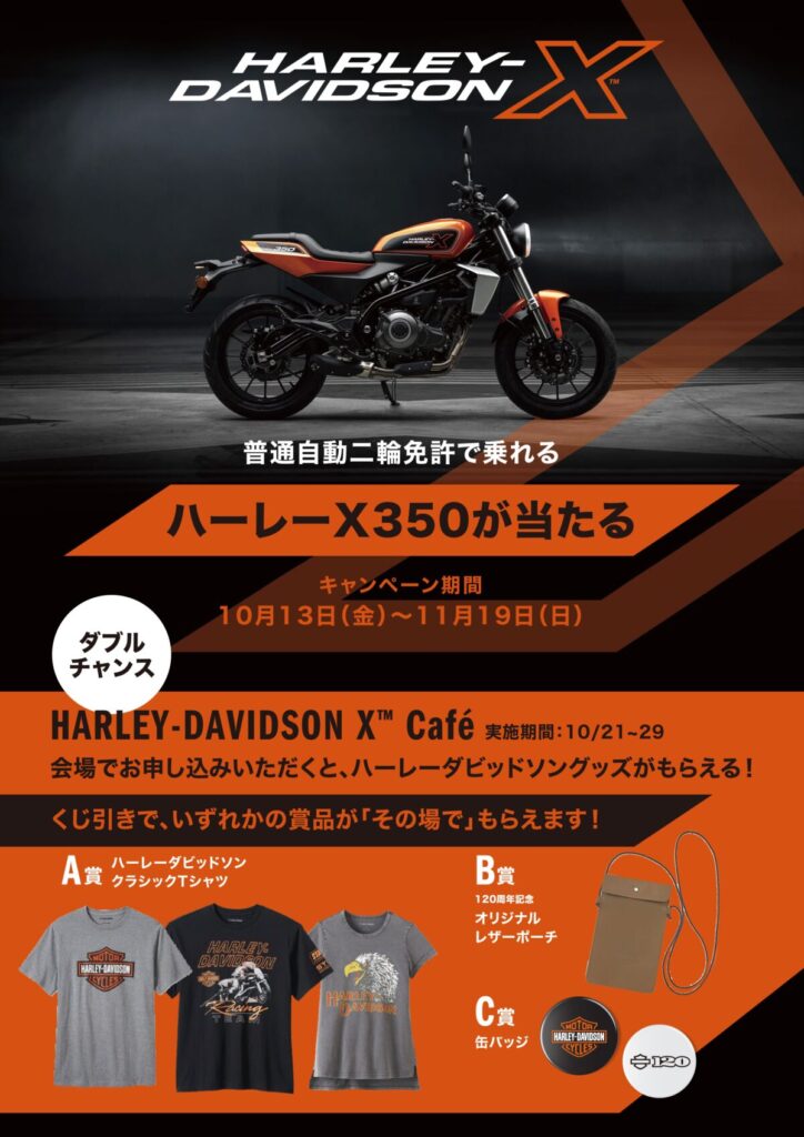 ハーレーダビッドソンジャパン株式会社は、普通自動二輪 MT 免許で乗れるハーレー「X350」の日本デビューを記念して、同モデルが限定1名に当たるプレゼントキャンペーン『GET X』を2023年11月19日まで開催する。キャンペーン特別ページより申込が可能で、当選者は11月下旬に発表される予定だ。また、2023年10月21日(土)~29 日(日)の期間限定でオープンする“HARLEYDAVIDSON X™ Café”会場内において応募したユーザーには、その場でハーレーグッズが当たるダブルチャンスも。ハーレー最小クラスの新モデルをゲットできる大チャンス!期間限定のXカフェを楽しみながら、キャンペーンにエントリーしてみてはいかがだろうか。