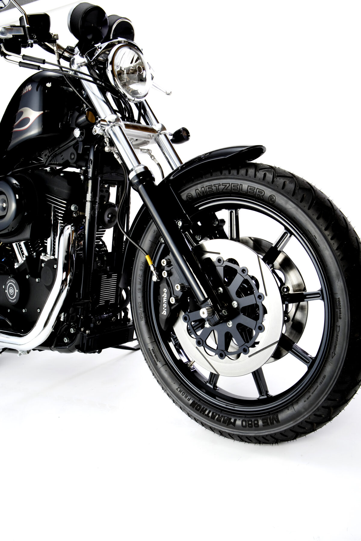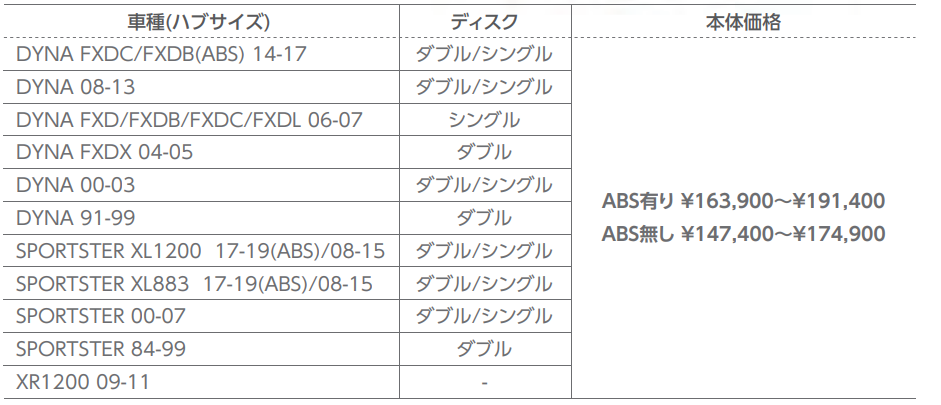 ホイールのインチアップ・ダウンに伴い、トレール量やハンドリングなど車両全体の走行性能が変わります。フォークピッチ・フェンダークリアランス・ベルトクリアランスなども同時に変更する必要があるため、ノーマル車両へは装着できません。