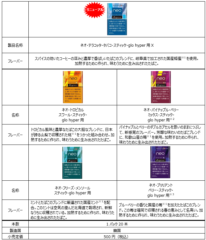 BATジャパン(本社:東京都港区赤坂、社長:エマ・ディーン、正式社名:ブリティッシュ・アメリカン・タバコ・ジャパン合同会社)は、加熱式たばこ「glo(TM)(グロー)」の専用たばこスティック「neo(TM)(ネオ)」ブランドより展開している銘柄「ネオ・テラコッタ・タバコ・スティック・glo hyper用」を、12月12日(火)(※1)より順次リニューアルします。