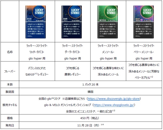 ブリティッシュ・アメリカン・タバコ・ジャパン(本社:東京都港区赤坂、社長:ジェームズ 山中)は、加熱式たばこ専用デバイス「glo(TM) hyper(グロー・ハイパー)」シリーズの専用たばこスティック「ラッキー・ストライク」から20本入りのラインナップ4銘柄を、本年11月28日(月)より順次、全国のコンビニエンスストアおよび全国のglo(TM)ストア、一般たばこ店(※1)、glo & VELOオフィシャルオンラインショップにて、450円(税込)で発売いたします。