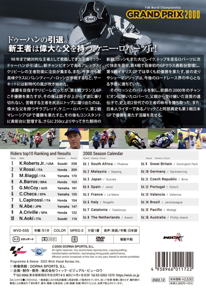 株式会社ウィック・ビジュアル・ビュ-ロウは、2022年12月22日(木)より、書店・バイク用品店・メーカー直販にてGRAND PRIX 2000 総集編【新価格版】を発売する。ドゥーハンの引退や、偉大な父をもつ、ケニー・ロバーツJr.のチャンピオン獲得などの内容となっている。また、毎月発売される「GRAND PRIX総集編」各シーズンDVDケース内にある応募券を、3枚1口としてハガキで応募したユーザーには、全8種のレジェンドライダー・アクリルフィギュアスタンドがもれなく当たるキャンペーンも開催。価格は、2,530円(税込)だ。