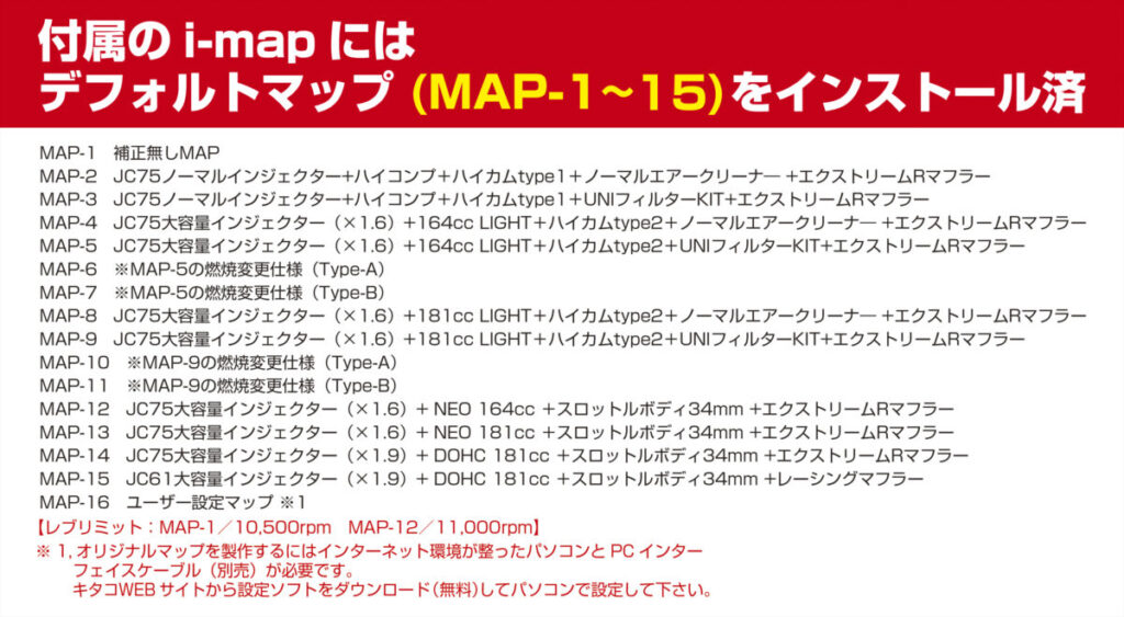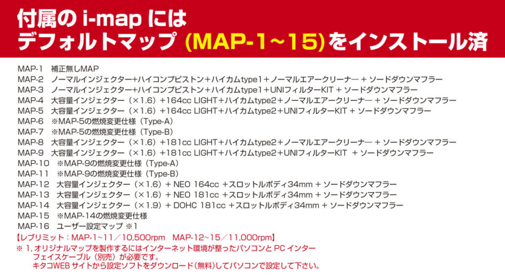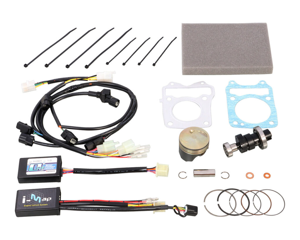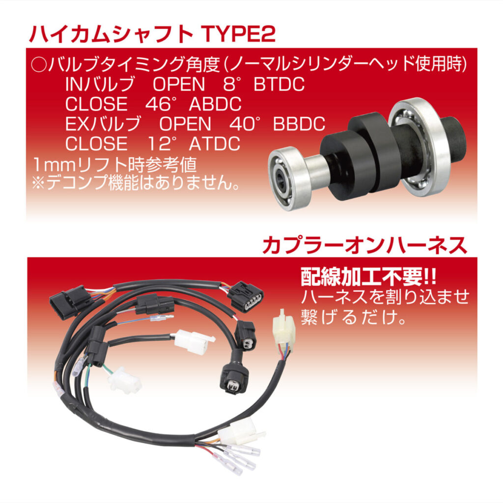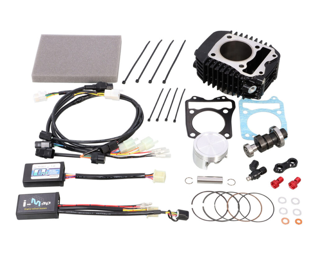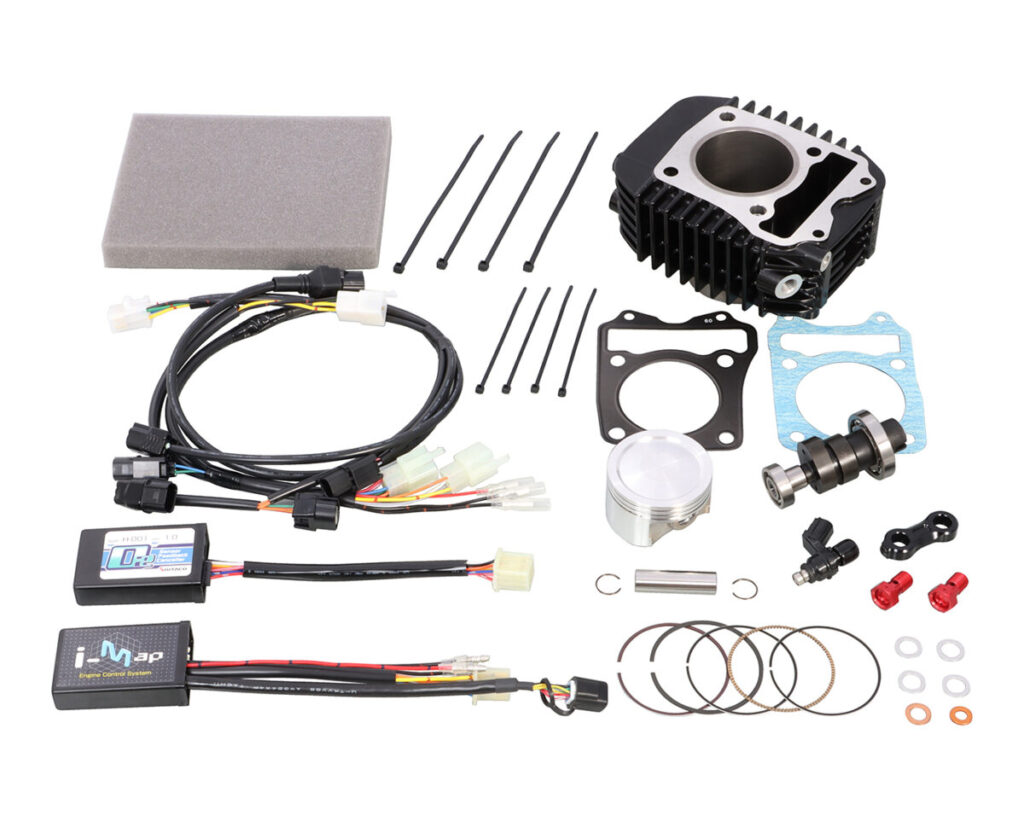 125ccのままで高出力化が可能なハイコンプピストン、ハイカムシャフト、センサーフィードバックキャンセラー、燃料噴射量をコントロールするI-MAPがワンセットになったコンプリートKIT。ノーマルと比較にならないパワーを搾り出せます。