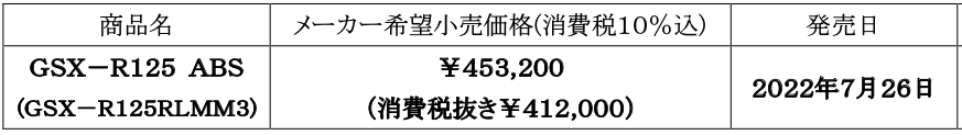 「GSX‐R125 ABS」は、初心者や若年層にも幅広く楽しんでいただける、GSX‐Rシリーズの エントリーモデルとなる原付二種スポーツバイクである。GSX‐Rシリーズの技術を投入した、高出力の 124cm3水冷単気筒DOHCエンジンと軽量でコンパクトな車体により、伸びやかで胸のすくような加速 感と、街乗りからワインディングまで、あらゆるシーンにおいて走る楽しさを提供する。GSX‐Rシリーズを 踏襲したフルカウルのスタイリングに、前後輪に17インチの大径ホイールと花弁形状のブレーキディスク や、ABSを標準装備した。また、スタータースイッチを押し続けずにワンプッシュするだけでエンジンが 始動する「スズキイージースタートシステム」など、利便性の高い装備を採用した。