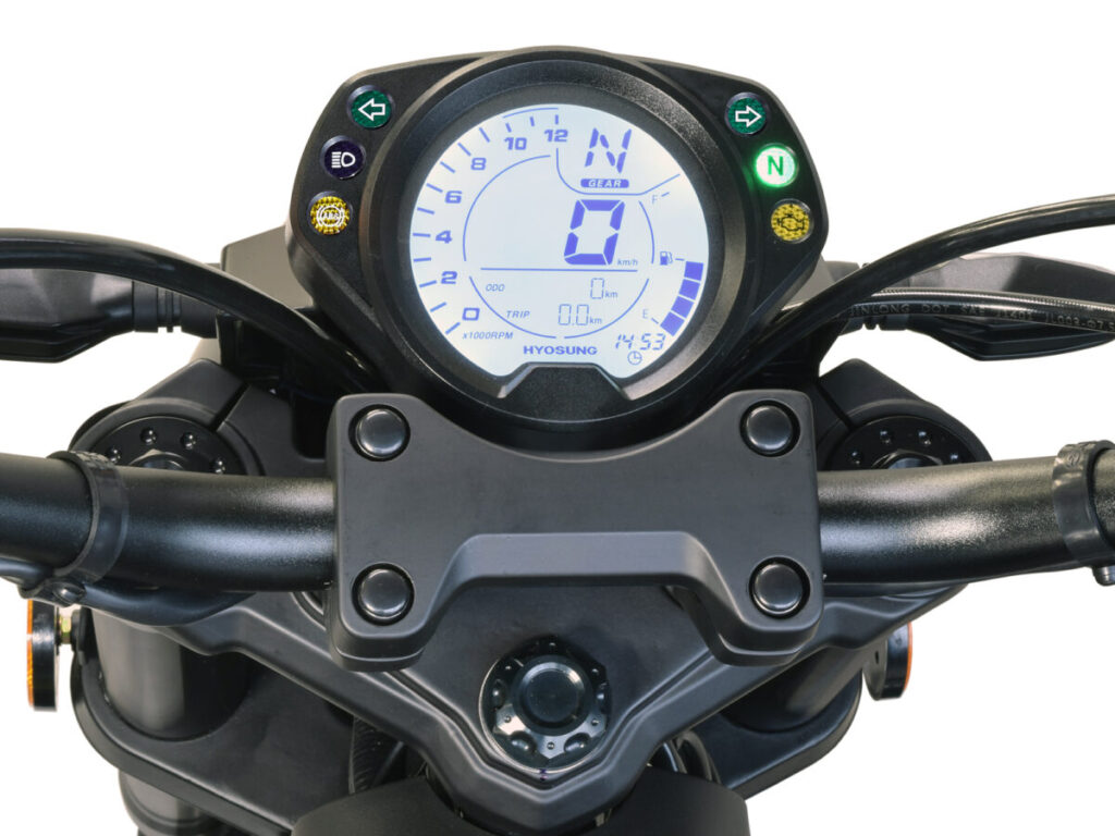 ギアポジション付き多機能 LCDメーター。メーターサイドには、携帯電子機器の使用に便利なUSB電源ソケットも装備しています。ステムナットとフォークキャップには、高級感漂うアルミ削り出しパーツを使用 しています。ハンドルは、剛性に優れ適度なしなりが振動低減にも効果のあるアルミテーパーバー(φ28.6mm)を使用しています。