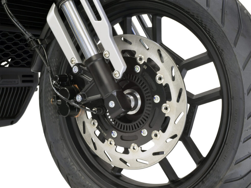 スポーティーな走りを支えるシャシーは、フロントフォークにφ37mm倒立タイプを新採用。ビギナーにも扱い易いコントロール性を重視したブレーキには、前後ABS を標準装備しています。タイヤは、フロント1 7インチ、リア16 インチの特徴的な組合せで、直進安 定性と素直なハンドリング性能を発揮します。