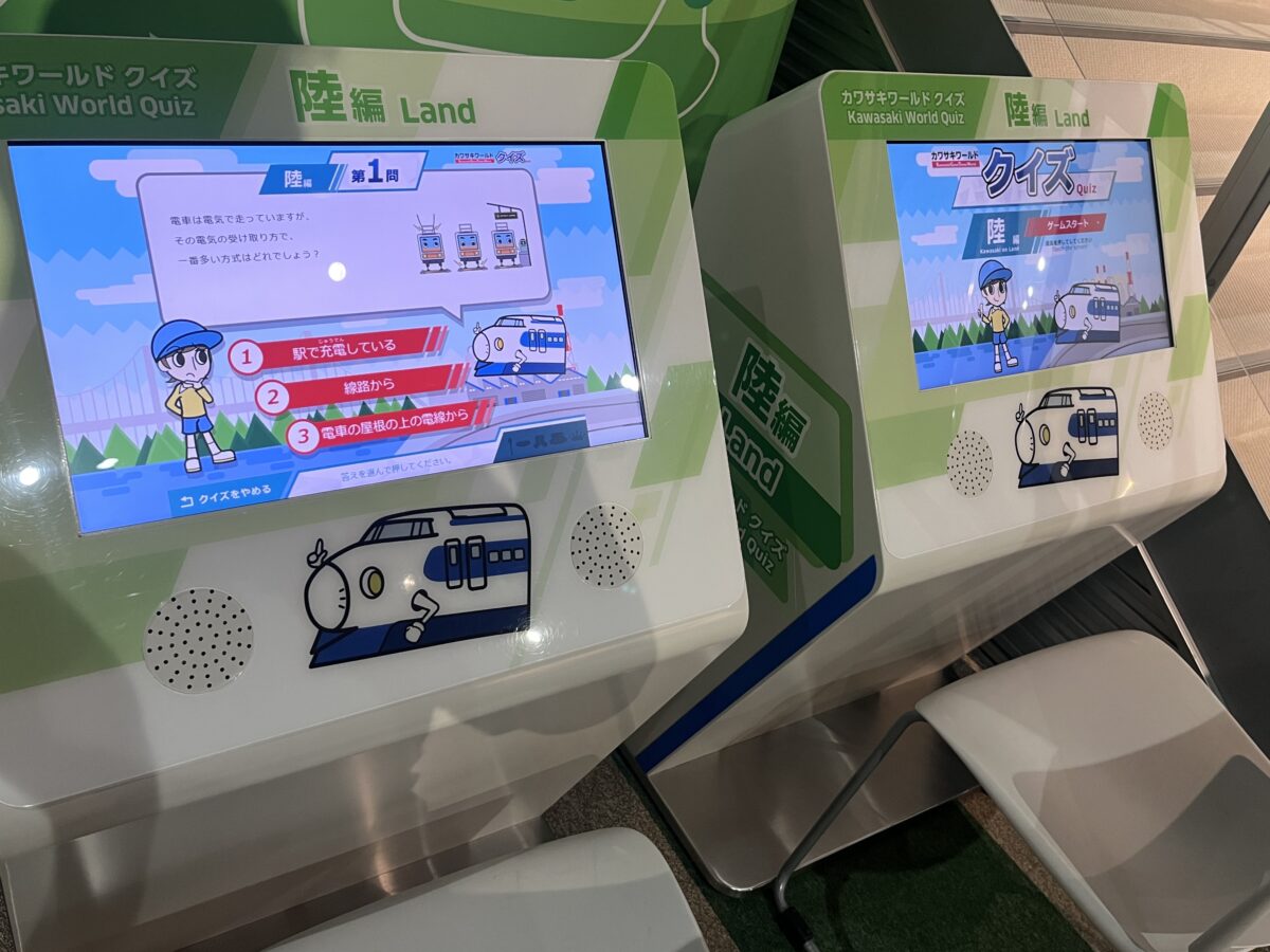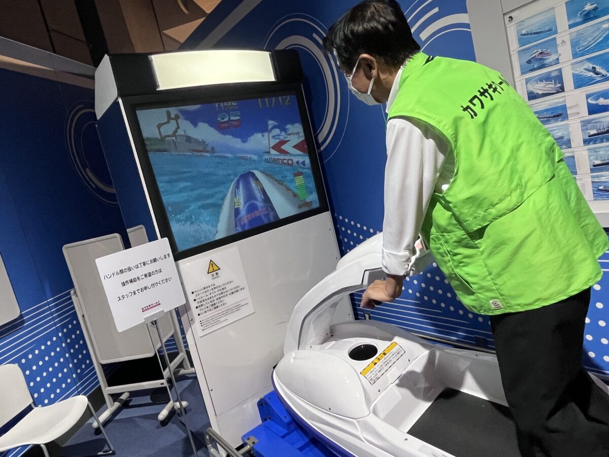 特徴的なのは各ゾーンに設置されたシミュレーターやゲームの豊富さだ。自由に運転できる鉄道模型ジオラマでは、運転席からの映像をモニターで楽しめるほか、「電車でGO!」の筐体で遊ぶこともできる。ほかにも水上バイクやヘリコプターの操縦シミュレーターなどがあり、さらに川崎重工にまつわるクイズゲーム機も設置されているので、ゲームを楽しみながらカワサキの歴史や事業を学ぶことができるのだ。