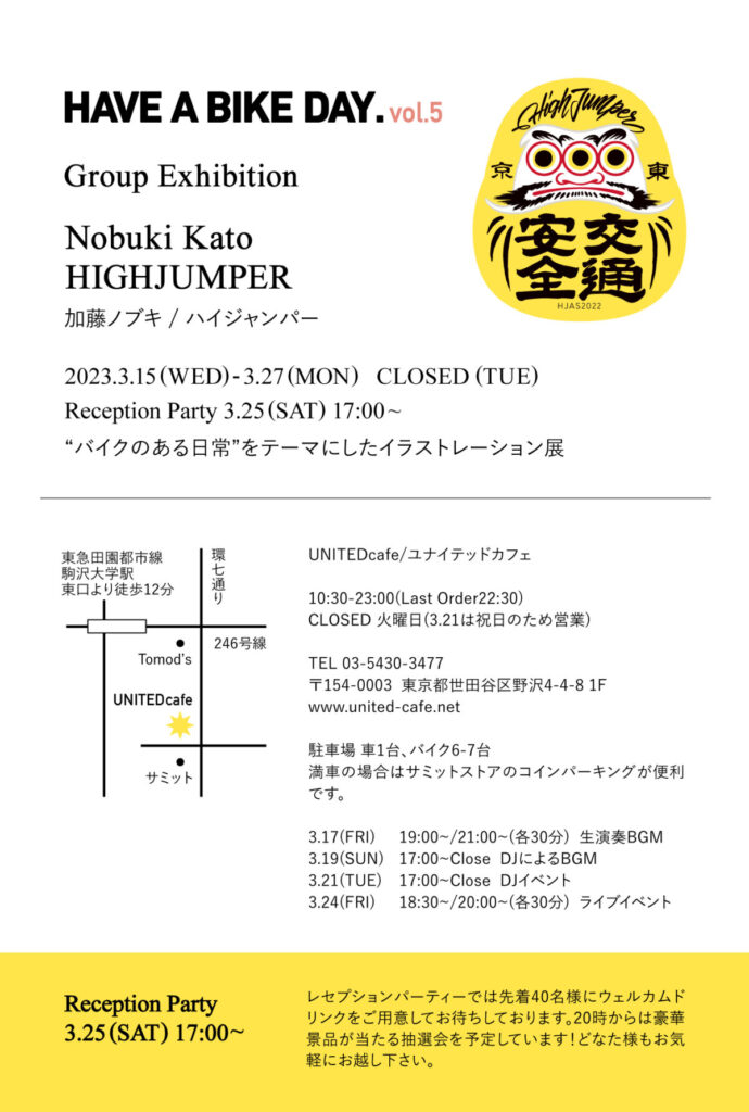 株式会社ユナイテッド・アーツは、自社で運営するユナイテッドカフェにて、バイクのある日常”をテーマにしたイラストレーション展【HAVE A BIKE DAY. vol.5】を開催すると発表した。5年目となる今回は、加藤ノブキ氏、HIGHJUMPER氏による2人展であり、両氏の作品に加えMOTORISTSによるカスタムバイクの車両展示なども行われる。2023年3月15日(水)~3月27日(月)の期間開催され、2023年3月25日(土)のレセプションパーティーでは豪華景品が当たる抽選会の実施を予定している。