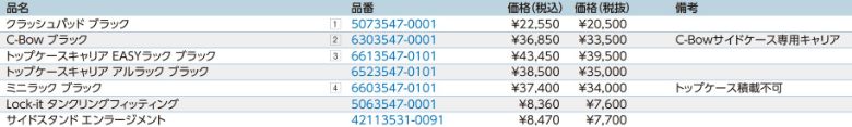 ラインナップに追加されたのは「クラッシュパッド」、「C-Bow」、「トップケースキャリア」、「ミニラック」、「Lock-it タンクリングフィッティング」、「サイドスタンド エンラージメント」などで、いずれも長期間のロングツーリングへ出かける際に是非取り付けておきたいパーツ達となっている。