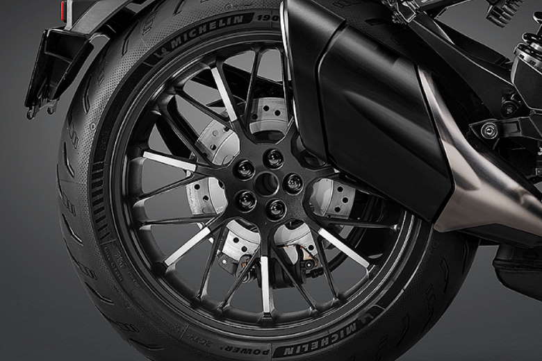 今回、車体色に精悍なグラファイトブラックを採用し、燃料タンクをはじめとして、ラジエーターシュラウド、シートレール、スイングアーム、マフラー、エキゾーストパイプなど、全体のカラーリングをブラックで統一。さらに、ホイールナットなど細部のパーツもブラックとすることで上質感、存在感を演出している。