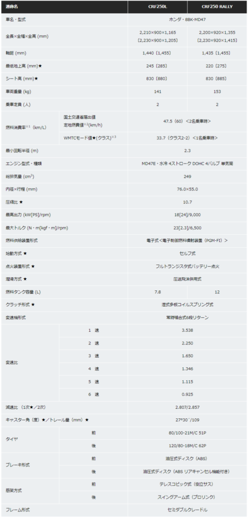 ●CRF250L、CRF250L<s>、CRF250 RALLY、CRF250 RALLY<s>ともに平成32年(令和2年)排出ガス規制に適合
