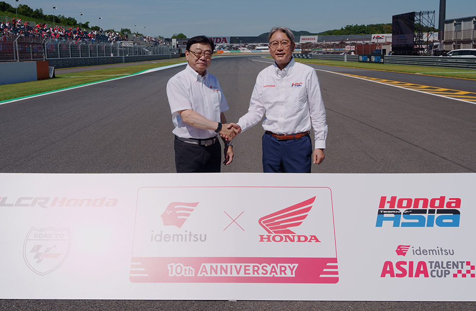 Hondaと出光興産株式会社は、「世界トップレベルで活躍できるアジア人ライダーの発掘・育成とアジア地域におけるモータースポーツ文化の醸成」を目的に展開しているライダー育成プロジェクトの10周年を記念し、日本グランプリの舞台である「モビリティリゾートもてぎ」にて記念セレモニーを行った。セレモニーには、出光興産の木藤俊一社長、ドルナ・スポーツのカルメロ・エズペレータ会長、Hondaの三部敏宏社長をはじめ、LCR Honda IDEMITSUの中上貴晶選手やIDEMITSU Honda Team Asiaの小椋藍選手など選手を含め監督も参加。若手ライダーの活躍やモータースポーツの活発化を願い、今後も同プロジェクトを続けていく。