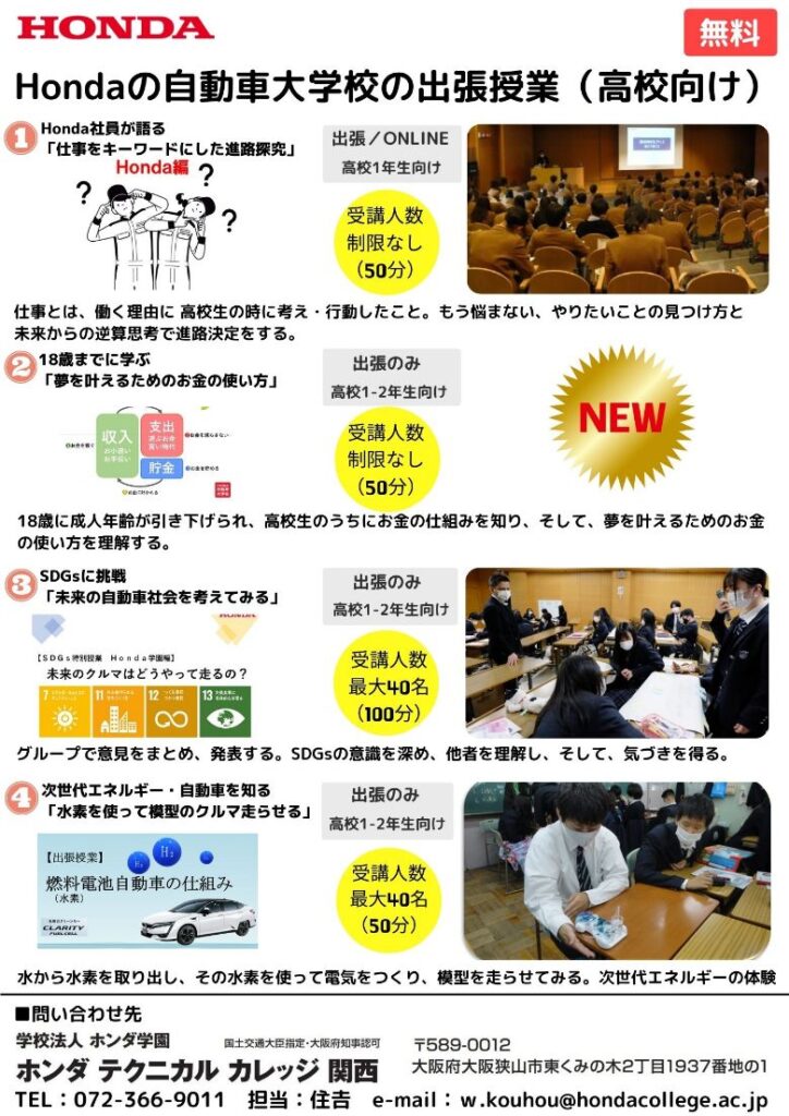 Hondaの自動車大学校「ホンダテクニカルカレッジ関西」は、2020年より大阪府内の高等学校を対象に出張授業を開始し、翌年には授業を3本に増やし更に対象エリアを関西に広げ、出張授業を展開している。