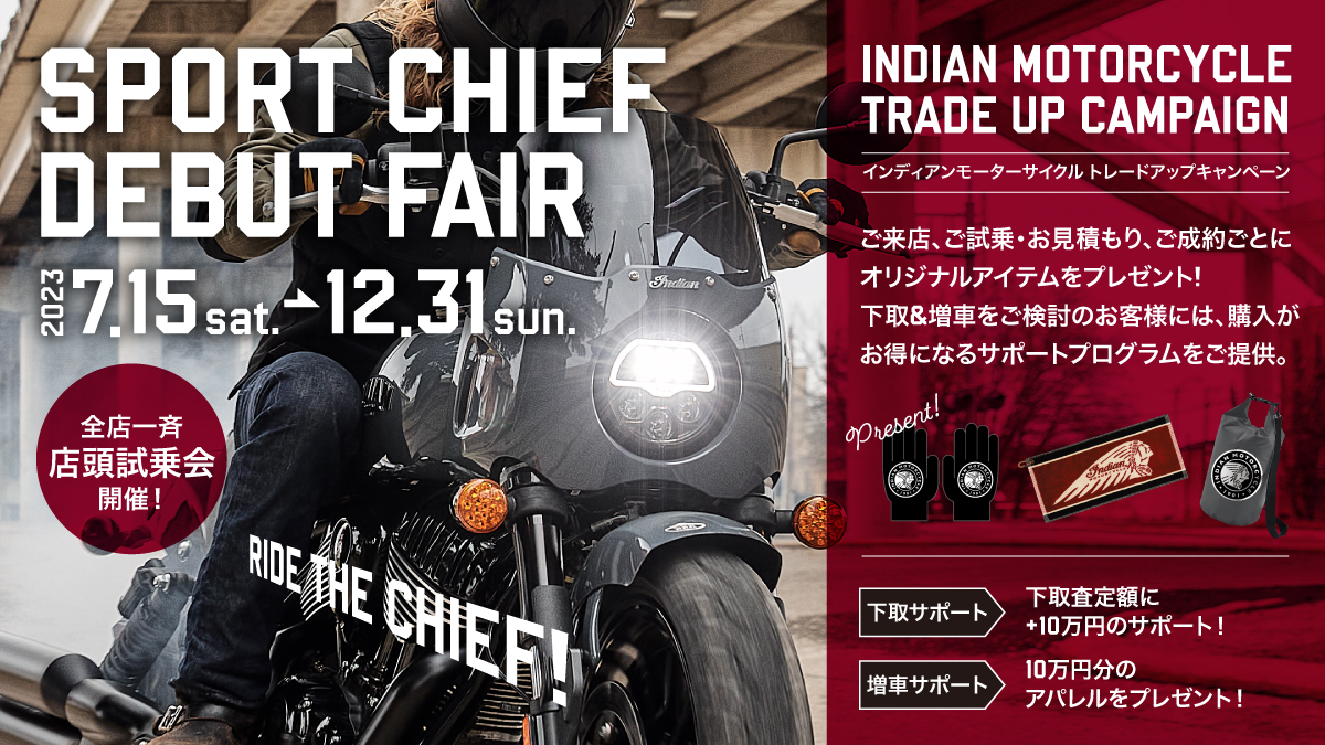 株式会社(神奈川県横浜市)は、スポーツチーフの日本上陸を記念して、ご来店、ご試乗・お見積り、ご成約いただいた方にオリジナルアイテムをプレゼントする「SPORT CHIEF DEBUT FAIR」と、下取や、イディアンモーターサイクルオーナーの増車をサポートする「INDIAN MOTORCYCLE TRADE UP
