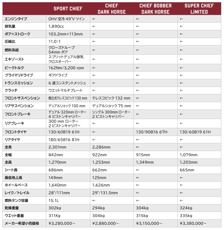 CHIEF」の他、「CHIEF DARK HORSE」、「CHIEF BOBBER DARK HORSE」、「SUPERCHIEF LIMITED」の、個性の異なる 4 つのモデルで構成されており、様々なユーザーの好みにフィットするユニークなキャラクターを有しています。