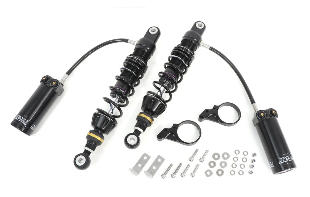 ツインショックではめずらしいホース付タンクタイプ。プリロード、伸側(REB)減衰調整に加え、圧側(COMP)減衰もHI/LOWそれぞれセッティング可能。コンビキットやエマルジョン、ストリートボックスもラインナップ。