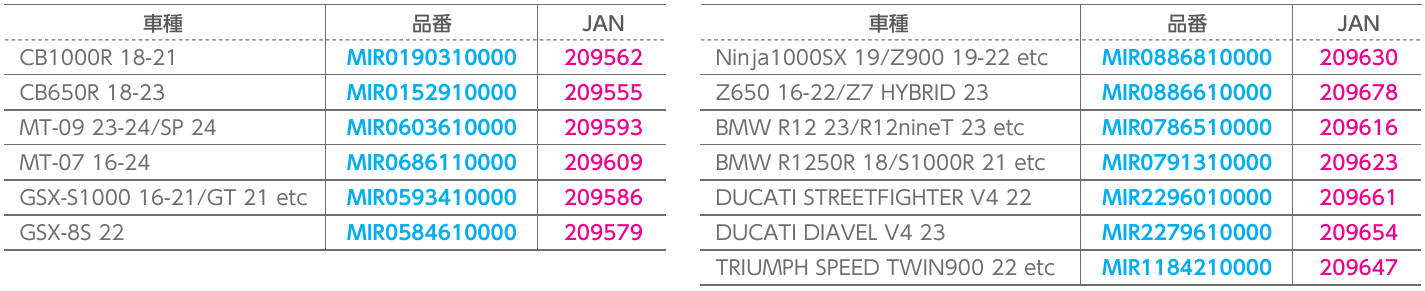 同製品は、鍛造アルミ製のミラー本体と空気力学的に設計されたミラーアームが特徴だ。CB1000RやMT-09、Ninja1000SXにBMW R1250Rなどさまざまな車両に対応している。価格は左右セットで39,270円(税込)。ネイキッドやレトロスタイルのバイクにもフィットする同製品で、愛車をスタイリッシュにカスタマイズをしてみてはいかがだろうか。