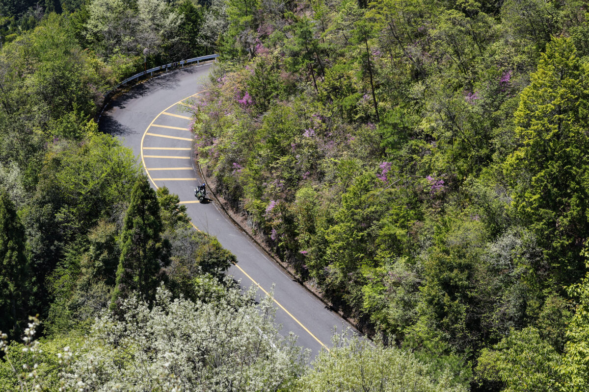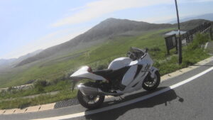 新緑が美しい季節、初夏を思わせる薄いグリーンの山々に、アエラが「京翠」と名付けたマットグリーンのアエラのハヤブサが溶け込んでいきます。試乗コースの嵐山-高雄パークウェイは多彩なコーナーを繋いだワインディングが特徴。北川さんが様々なこと確かめるようにゆっくりと走り出すと、フルチタンマフラーからは心地よいハヤブササウンドが轟きます。