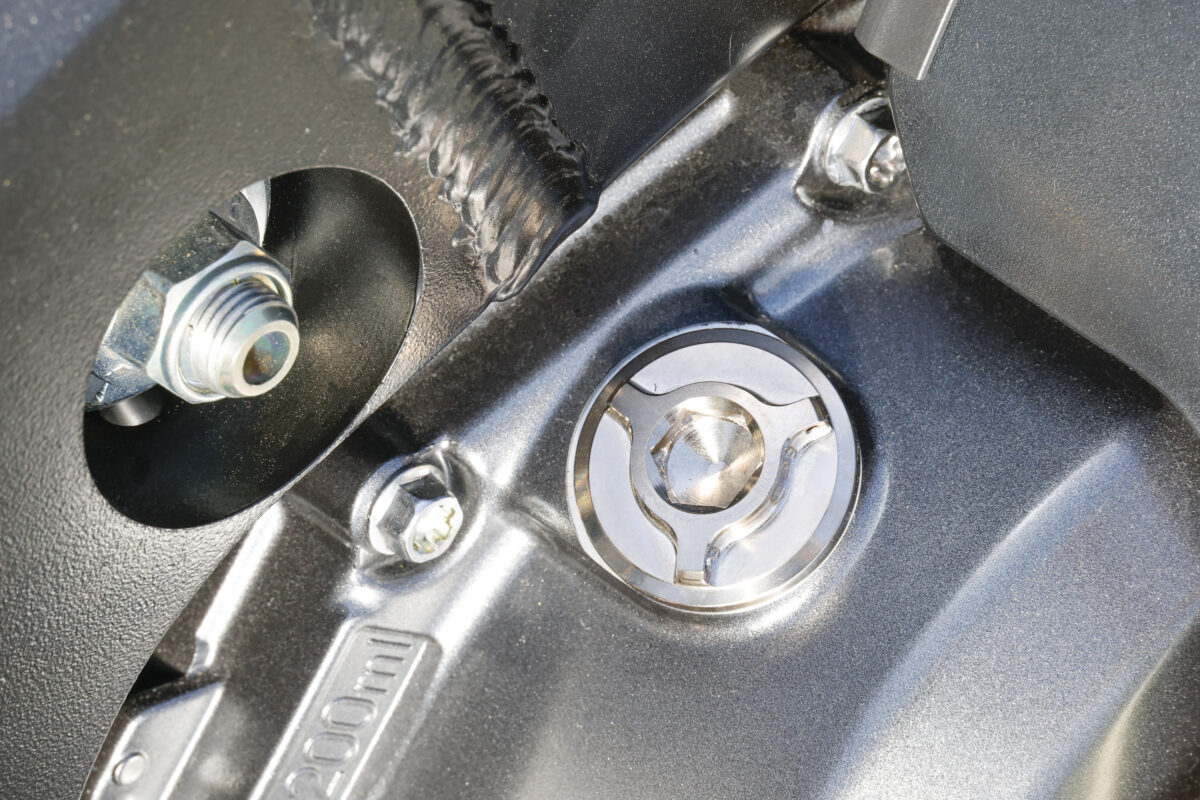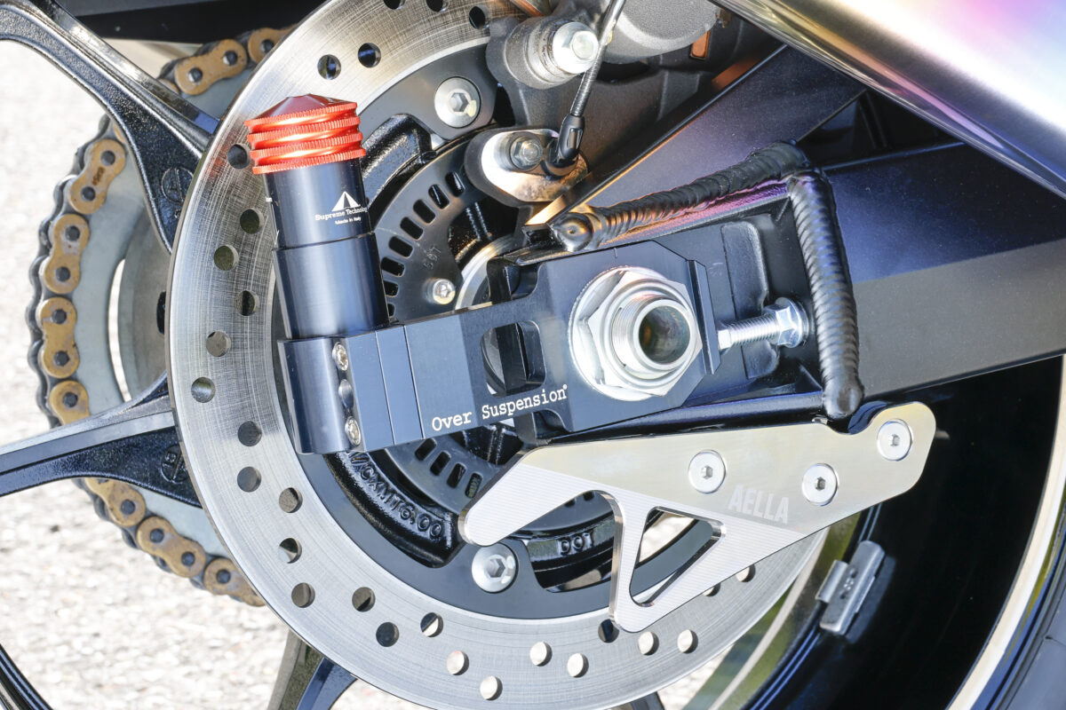 V字タイプのリヤスタンド用フック。MFJの規格に準拠した6mm厚のアルミを使用。位置決めは偏芯カラーを使用し、ボルトの外周にジュラコン(樹脂)を装着し、スイングアームの傷つきを防止。写真の無電解ニッケルめっきはプロトタイプ(今後、発売予定)。スイングアームエンドに装着されたオーバーサスペンションは、イタリアのシュプリーム テクノロジー製。ハヤブサ用は絶賛開発中だ。