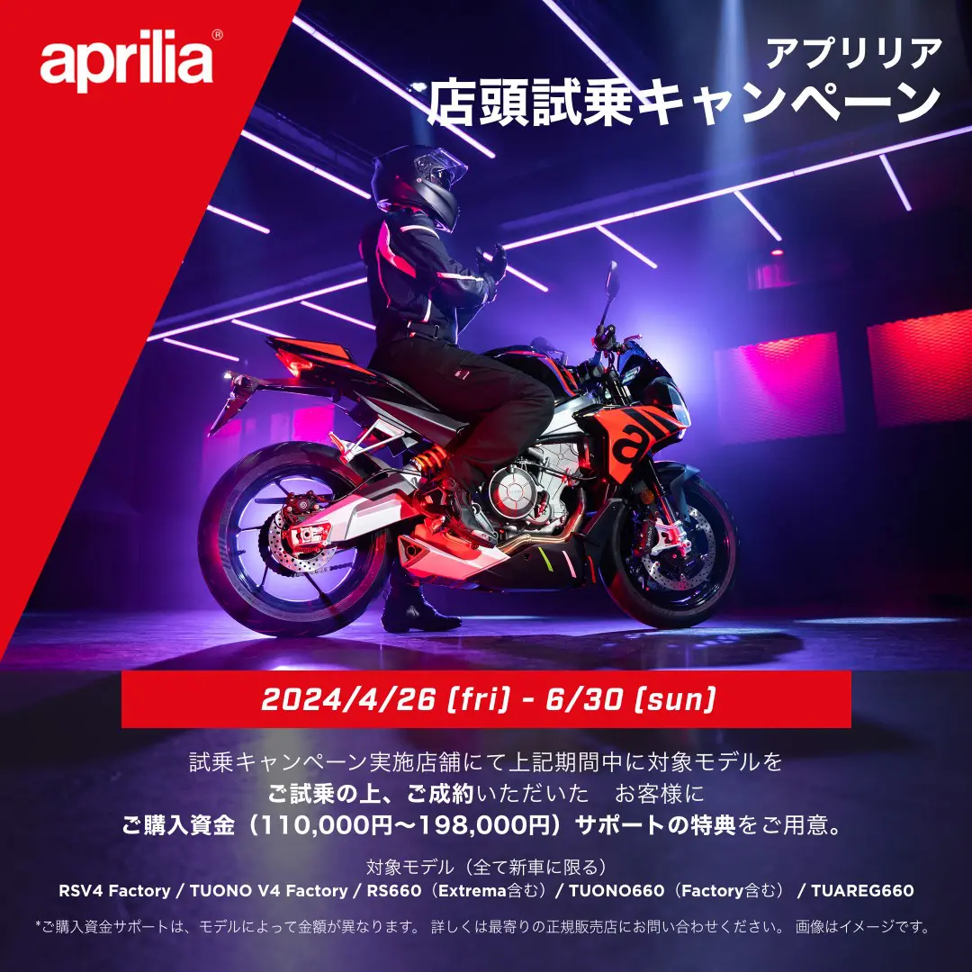ピアッジオグループジャパン株式会社 (本社:東京都港区芝 2 丁目、代表取締役 ネリ・ミクラウス)は、スタイリッシュでスポーツマインドあふれるデザインは勿論、本物志向の走りと楽しさを両立させたアプリリアのスポーツバイクの魅力をご体感いただける試乗キャンペーンを、2024 年 4 月 26 日(金)から 6 月 30 日(日)まで、アプリリア正規販売店のうちキャンペーン対象店舗にて実施いたします。
