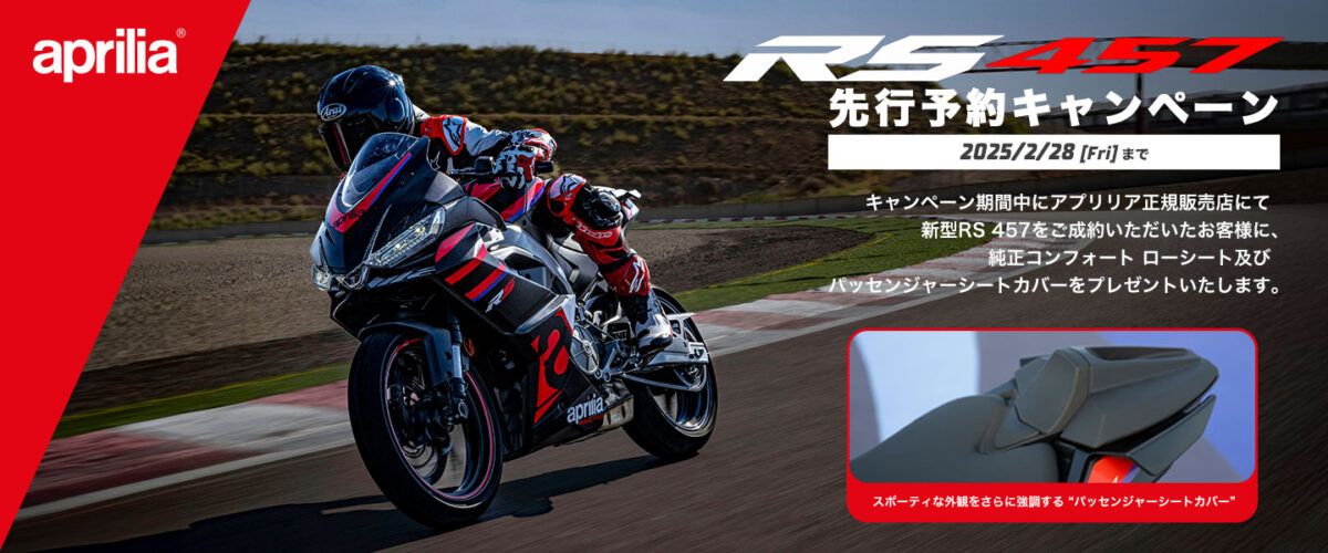 ピアッジオグループジャパン株式会社(本社:東京都港区芝二丁目、代表取締役:ネリ・ミクラウス)は、洗練されたテクノロジーと純粋なレーシングスタイルを継承したライトウェイトスポーツモデル、アプリリア新型RS 457 の本格入荷を前に『新型RS 457 先行予約キャンペーン』を、全国のアプリリア正規販売店にて、2025年2月28日(金)まで実施致します。