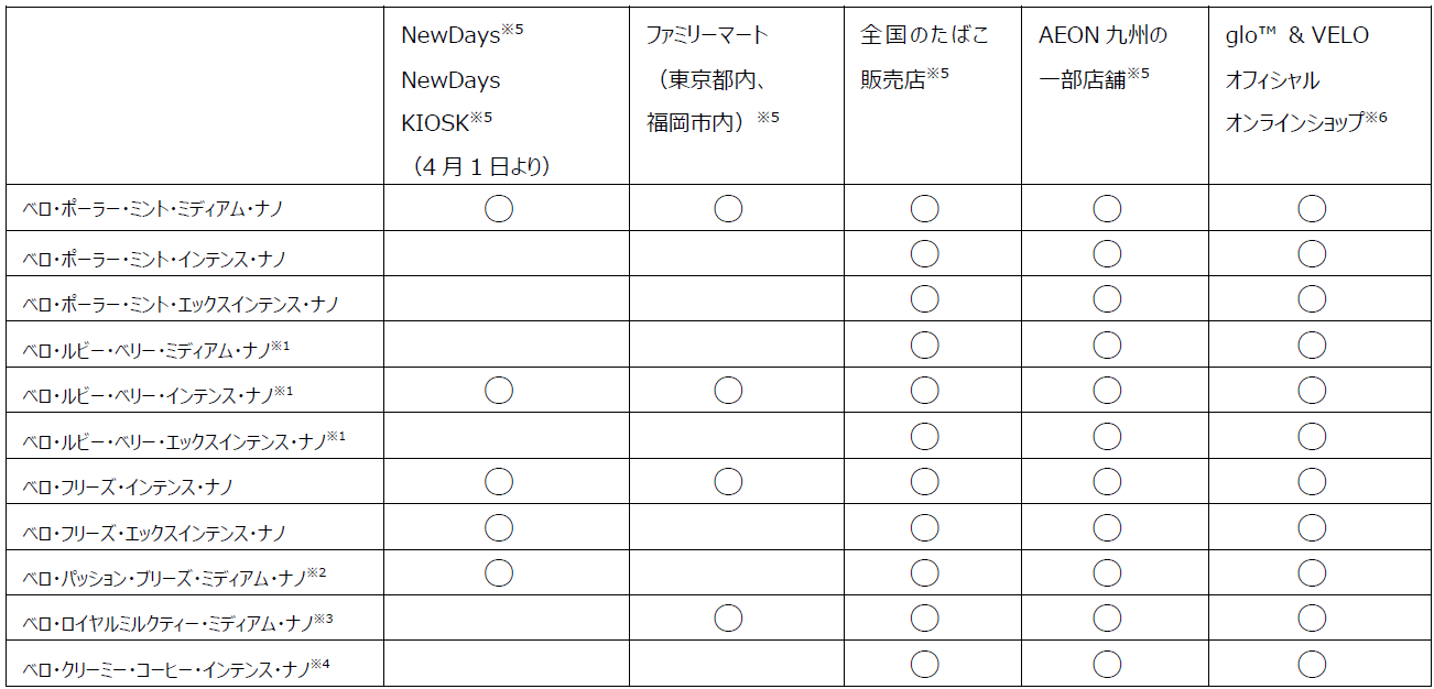 新ジャンル・オーラルたばこ「VELO」は、たばこ葉を燃焼も加熱もしないことから紙巻たばこと比較して有害性物質の発生が99%低減(※1)されている、紙巻たばこに代わる代替製品の一つです。日本においては2020年2月に福岡市にて発売されて以来、販売チャネルを徐々に拡大しています。今後も変化するお客様の好みや嗜好に合わせ、多様な刺激・フレーバーの製品を、より身近な場所、そして親和性の高い使用シーンでお求めいただけるよう展開してまいります。