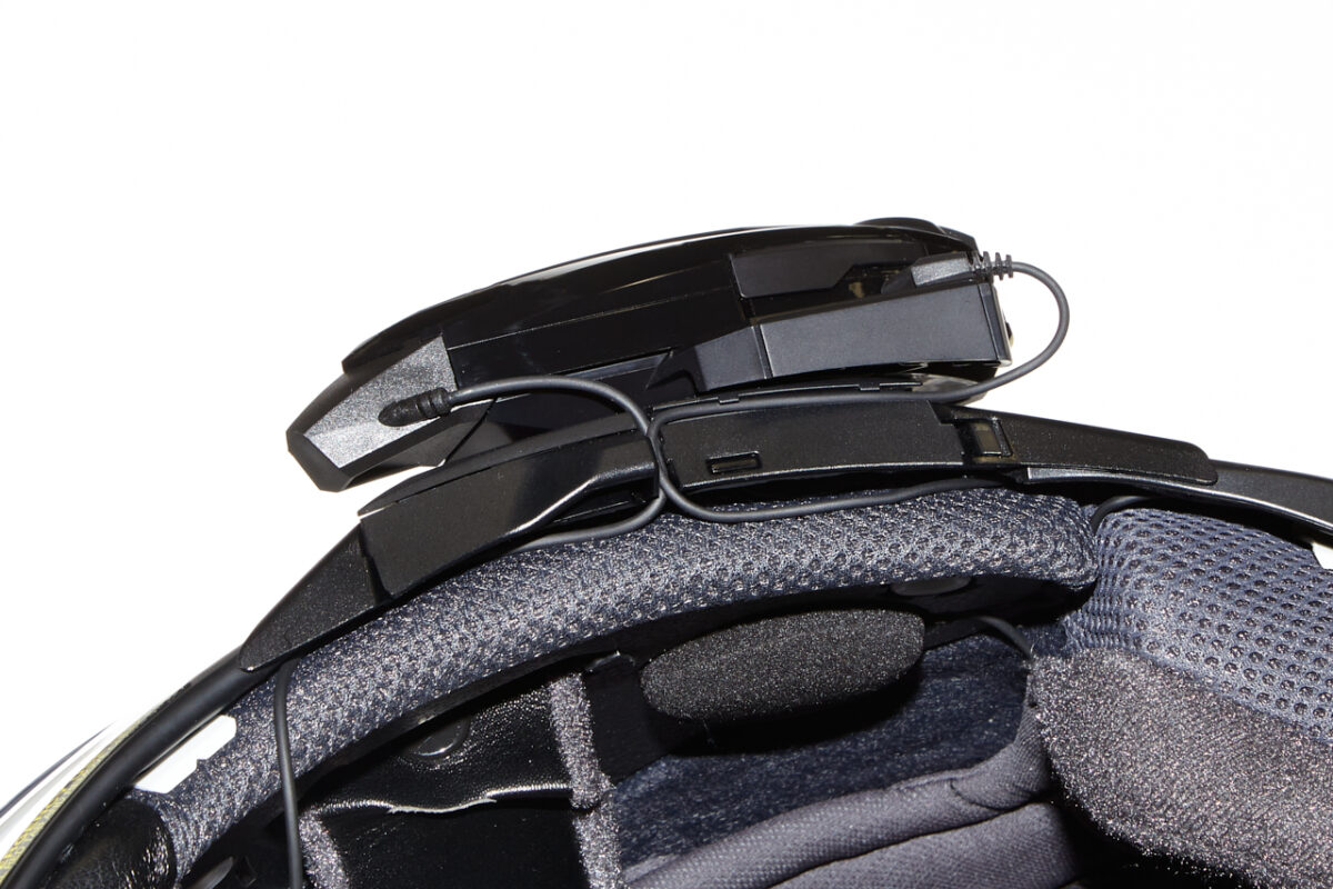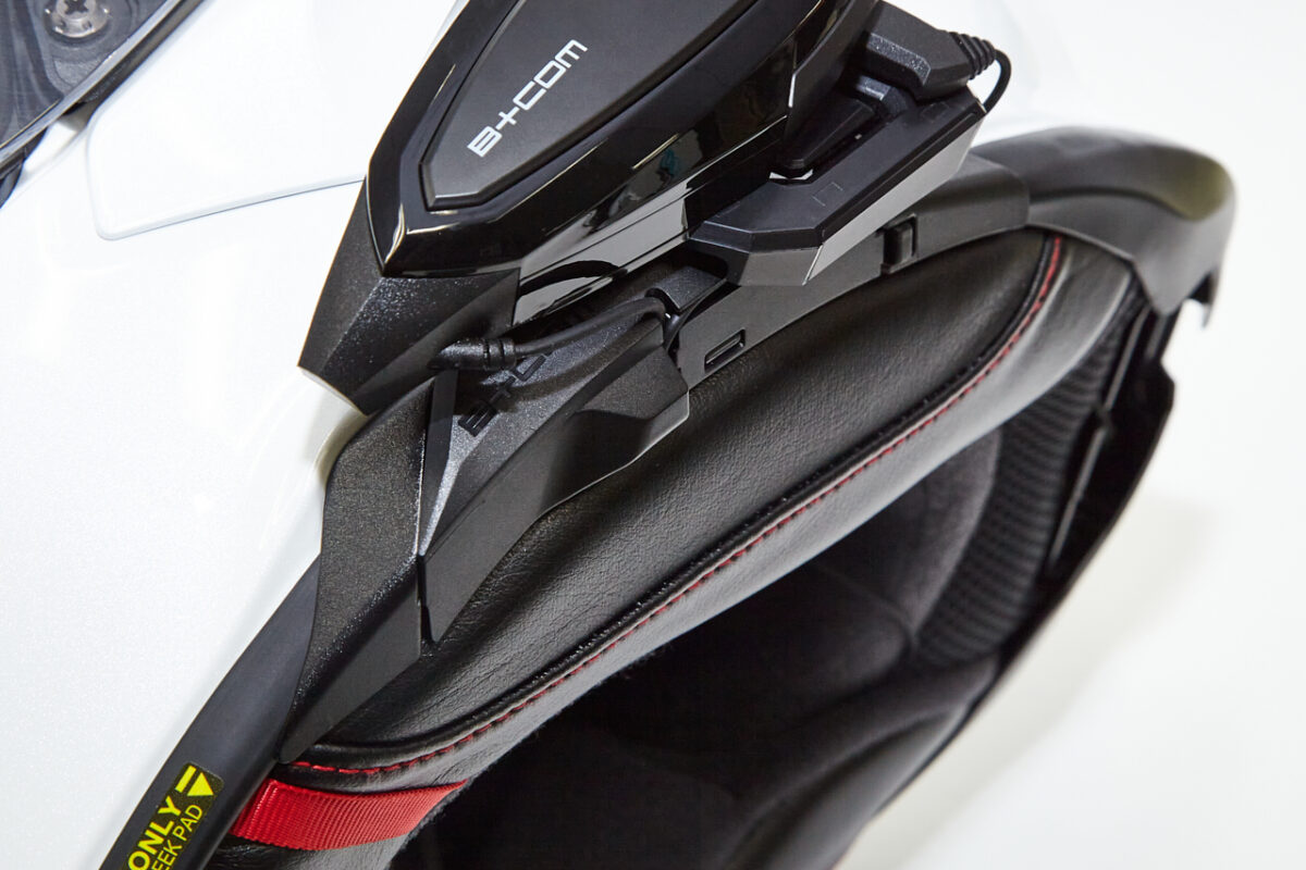 SHOEIヘルメット「GT-Air 3」「 NEOTEC 3」には、専用設計のビルトインモデル「B+COM SX1」などのインカム装着用のインターコムベースカバーが標準で装着されています。専用設計のインカムでないと、このベースカバーを避ける必要があり、適切な位置への取付けが難しくなります。
