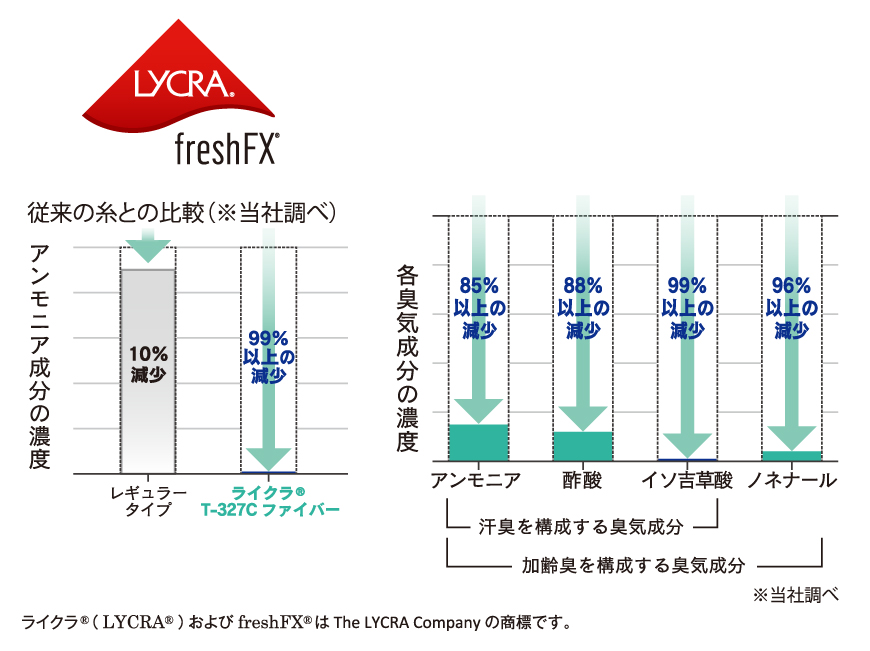 さらに、製品全体に消臭糸 「ライクラ®fresh FX®」 ファイバーを採用。汗の臭いの原因である、アンモニア、酢酸、イソ吉草酸に加え、加齢臭の原因と言われる、ノネナールにも効果を発揮します。