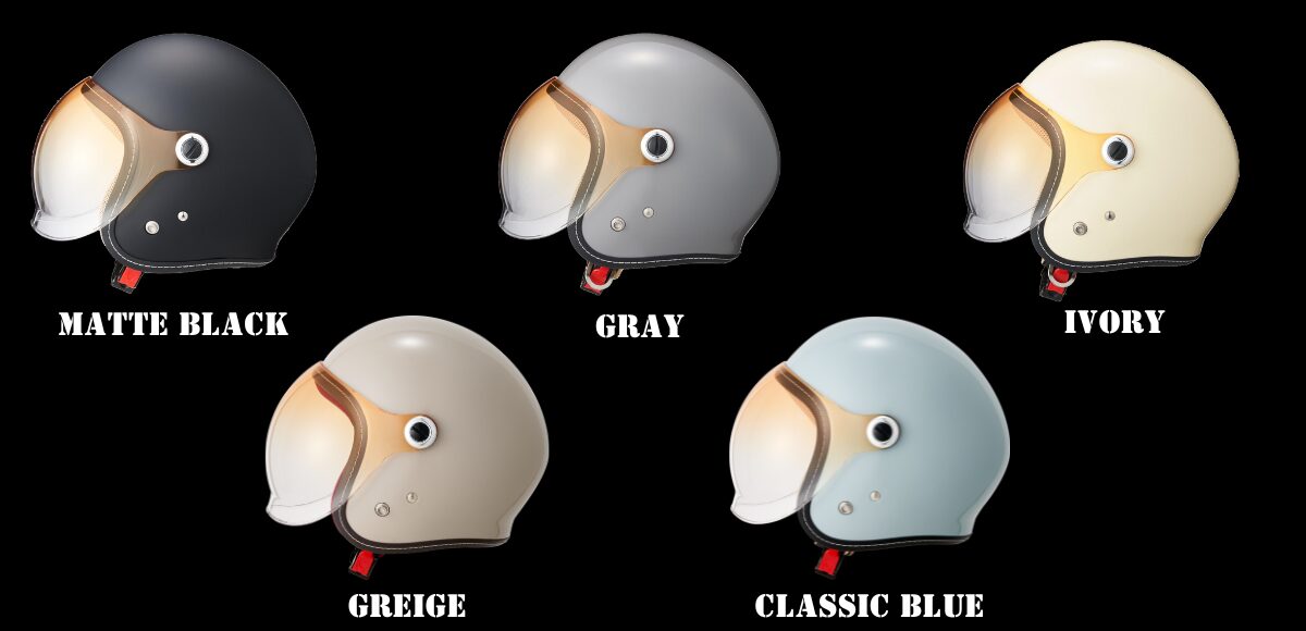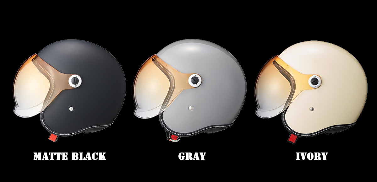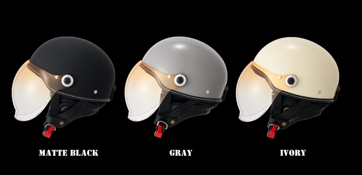 カジュアルな装いにマッチする3カラー展開のハーフタイプヘルメット。美しいアンバーグラデーションのバブルシールドはワイドな視界を確保し、昼夜を問わず使用可能です。あご紐には、着脱しやすいラチェットタイプを採用。スクーターの標準的なメットインに収納でき、日常使いに最適です。