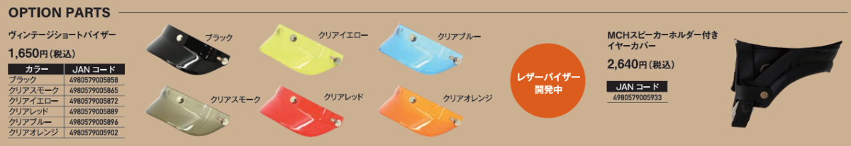 サイズはM、Lとも同じ帽体を使用しており、Mサイズ54~55㎝、Lサイズ56~57cm。MとLの内装パッドは互換性があります。また、クリアシールドとスモークシールドもオプションでご用意しています。