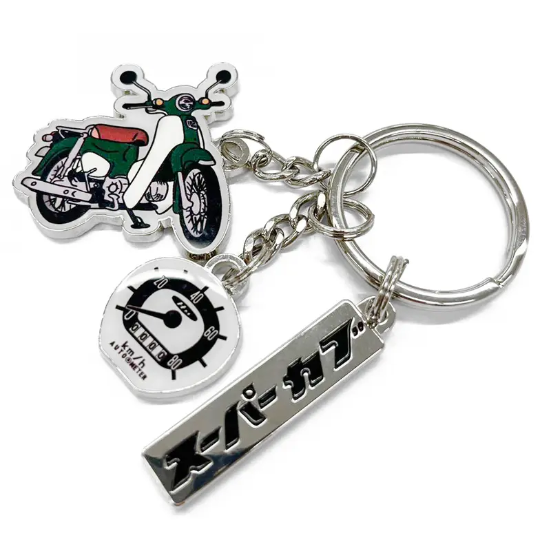 スーパーカブのレトロな文字と車体のチャーム、それからメーターをイメージしたチャームの3つのチャームがメタリックに輝く、しっかりとした作りの高級感のあるキーチェーンとなっております。