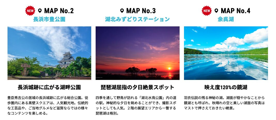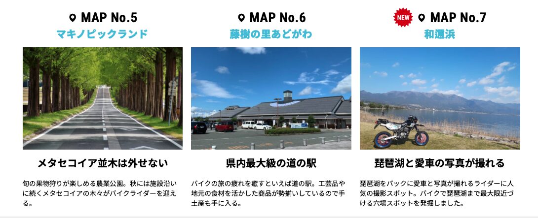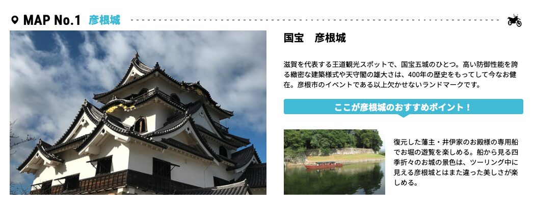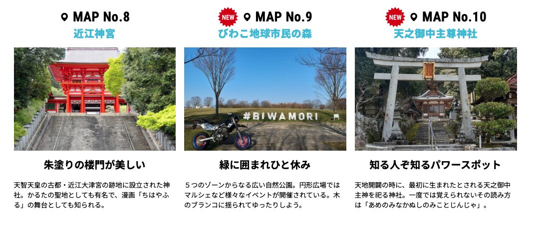 今年のスタンプラリースポットは、地元を知り尽くしたライダーが琵琶湖周辺の王道観光スポットから、地元民しか知らないコアなスポットまで10ヶ所を厳選して設定しました。