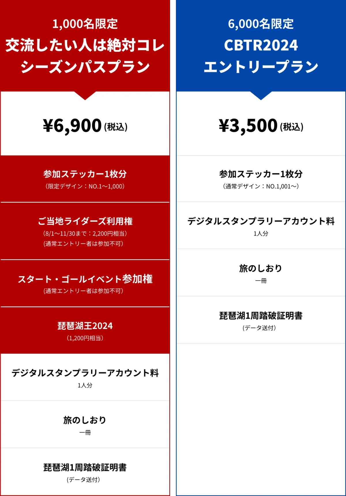 含まれるもの:参加ステッカー(ゼッケンNO.1−1000)、ご当地ライダーズ利用権、スタート・ゴールイベント参加権、琵琶湖王2024参加権、デジタルスタンプラリーアカウント料、旅のしおり、琵琶湖1周踏破証明書(データ・踏破者のみ)