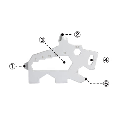 ①マイナスドライバー②プラスドライバー③六角レンチ④キーホール⑤ボトルオープナー