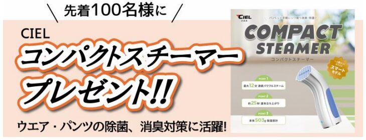 6 月 21 日(金)~7 月 31 日(水)の期間中、弊社取扱いブランド CIEL(シエル)より発売中のドライブレコーダーYUMI をお買い上げのお客様【先着 100 名様】へコンパクトスチーマーをプレゼント致します。
