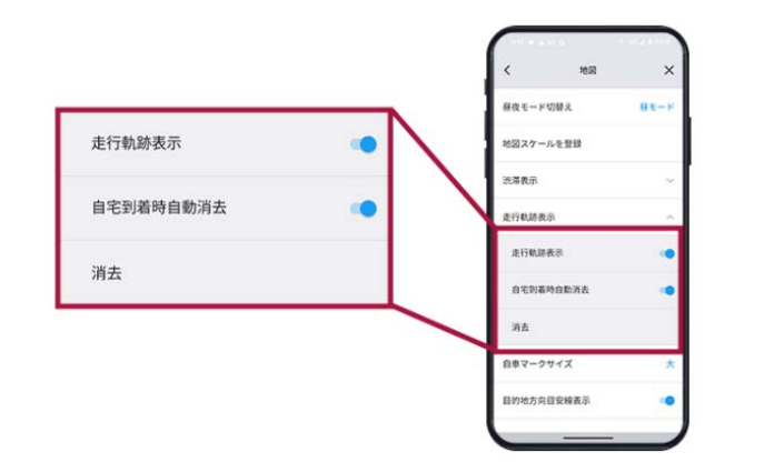自宅へ到着したタイミングで、全ての走行軌跡を消去する「自宅到着時自動消去」を選択できるようになりました※。