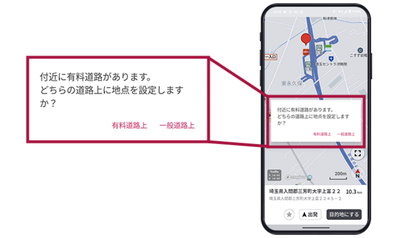 地図上の任意の場所を長押しして目的地/立寄地を設定する際に、有料道路と一般道路のどちらに地点設定するか選択できるようになりました。